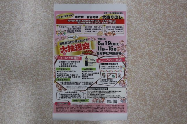 このコロナ禍の中、恒例となりました本町会と愛宕町会の合同大売り出しが今週6月4日(土)から開催されます。長年の歴史を誇る歳末恒例の大売り出しを、お客様の要望に応え、夏にも大売り出し大抽選会を開催するようになって3回目を迎えます。コロナ...